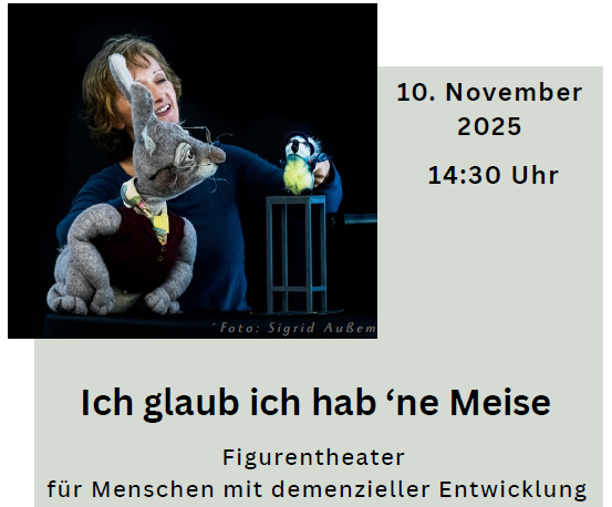 Die Seniorenvertretung der Stadt Dinslaken lädt zum Figurentheater „Ich glaub ich hab ne Meise“ für Menschen mit demenzieller Entwicklung ein.
