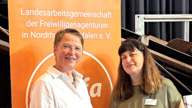 Westfalen einsetzen. Über 400 Gäste nahmen das interessante Tagungsprogramm wahr. Engagiert in und für Sorgende Gemeinschaften ist die Landesarbeitsgemeinschaft Freiwilligenagenturen (LAGFA NRW), vertreten durch Stefanie Krause -rechts in Bild – und auch die Regionalbüros Alter, Pflege und Demenz, hier links im Bild vertreten durch Ulla Woltering vom Regionalbüro Alter, Pflege und Demenz Münsterland. In der Gesprächsrunde „Mehr als Ruhestand – Teilhabe im Alter gestalten“ zeigte sie eindrucksvoll auf, wie wichtig es ist, älteren Menschen sinnstiftende Beteiligungsmöglichkeiten zu eröffnen – nicht nur als Empfänger:innen von Fürsorge, sondern als aktive Mitgestaltende ihrer Lebensumwelt. Woltering