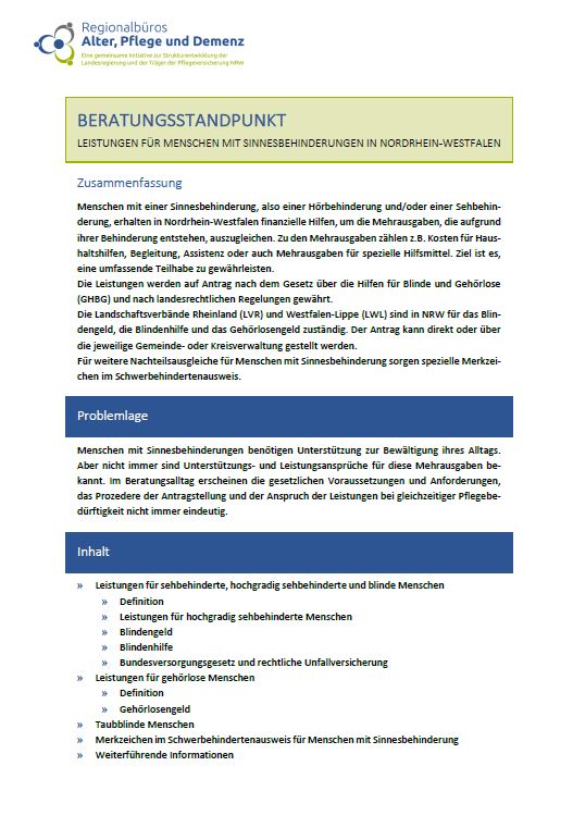 Die Kompetenzgruppe Pflegeberatung der Regionalbüros Alter, Pflege und Demenz hat neue Fachinformationen für Pflegeberater*innen zum Thema „Leistungen für Menschen mit Sinnesbehinderungen in Nordrhein-Westfalen“ veröffentlicht.