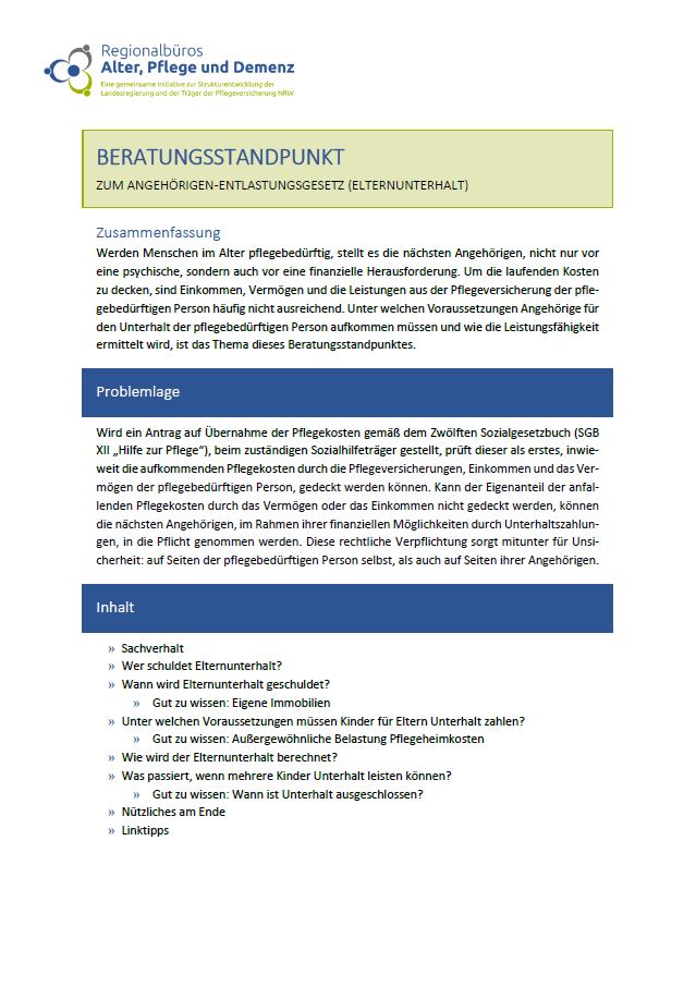 Der Beratungsstandpunkt informiert, unter welchen Voraussetzungen die Angehörigen für den Unterhalt der pflegebedürftigen Person aufkommen müssen und wie die Leistungsfähigkeit ermittelt wird. Er steht kostenlos zum Download in unserer Mediathek zur Verfügung.