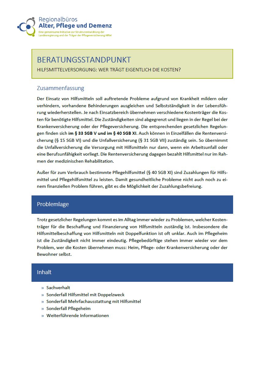 Der Beratungsstandpunkt veranschaulicht, welche Kostenträger für die jeweiligen Hilfsmittel zuständig sind. Die Zuständigkeiten liegen in der Regel bei der Krankenversicherung oder der Pflegeversicherung.