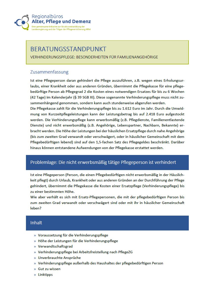 Die Kompetenzgruppe Pflegeberatung der Regionalbüros Alter, Pflege und Demenz hat neue Fachinformationen für Pflegeberater*innen zum Thema „Verhinderungspflege: Besonderheiten für Familienangehörige“ veröffentlicht. Der Beratungsstandpunkt klärt die Voraussetzungen für die Verhinderungspflege und informiert über die Höhe der Leistungen.