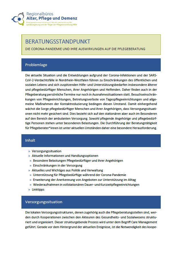 Die Kompetenzgruppe Pflegeberatung der Regionalbüros Alter, Pflege und Demenz hat neue Fachinformationen für Pflegeberater*innen zum Thema „Corona-Pandemie und ihre Auswirkungen auf die Pflegeberatung“ veröffentlicht. Der Beratungsstandpunkt verschafft Klarheit und hilft, die aktuelle Situation zu überblicken.