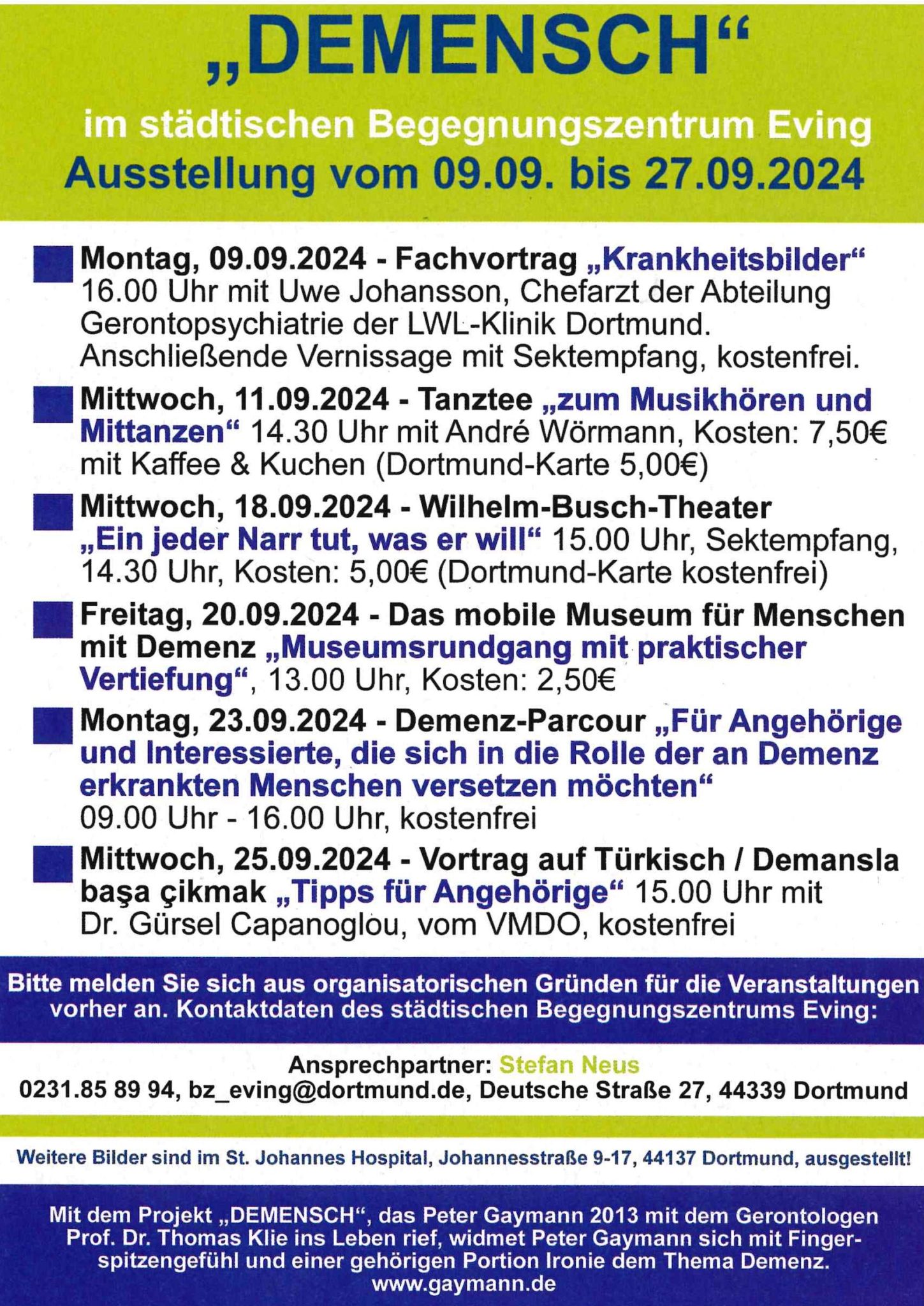 Als Begleitprogramm finden verschiedene Vorträge, Theaterstücke und die Möglichkeit der Selbsterfahrung durch den Demenz Parcours statt.