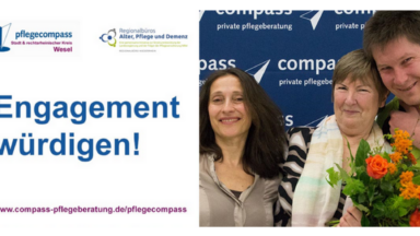 Mit dem Engagementpreis „pflegecompass“ im rechtsrheinischen Kreis Wesel möchten das Regionalbüro Alter, Pflege und Demenz Niederrhein und die Pflegeberatung compass das Engagement von pflegenden Angehörigen, ehrenamtlich Pflegenden und Angeboten vor Ort würdigen.