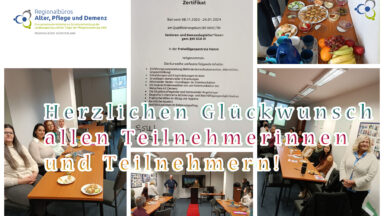 erfolgreichen Abschluss des Kurses und die Zertifikatsübergabe gemeinsam gefeiert. Der Kurs umfasste 40 Unterrichtsstunden, inhaltlich unter anderem Grundlagen der Kommunikation, die innere Erlebenswelt von Menschen mit Demenz, den Umgang mit Notfallsituationen, die besondere Situation pflegender Angehöriger und weitere Themen wurden bearbeitet.