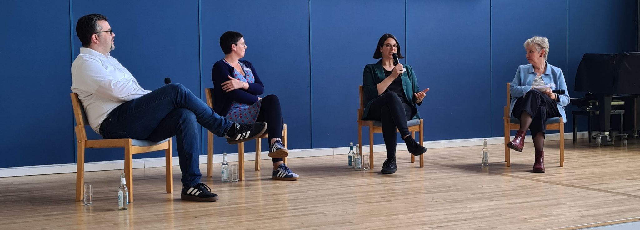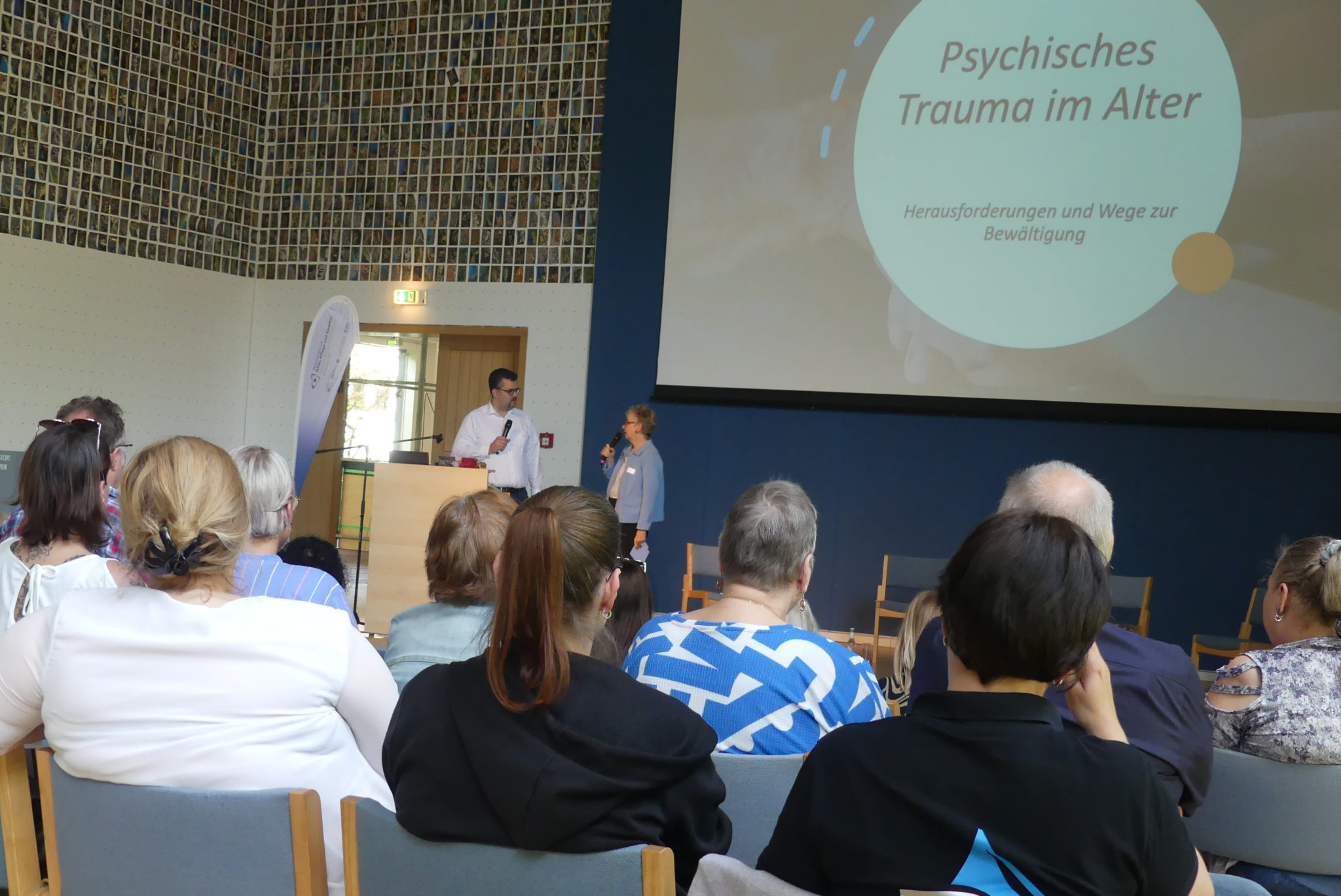 In der Pause hatten die Teilnehmenden Zeit, sie gegenseitig auszutauschen und die ausgelegten Informationsmaterialien zu den verschiedenen Themen zu sichten. Nach drei Vorträgen zu den Themen Einsamkeit, Gewalt in der Pflege und Trauma im Alter hatten die Teilnehmer*innen in der Podiumsdiskussion die Möglichkeit, den Profis aus den verschiedenen Institutionen.
