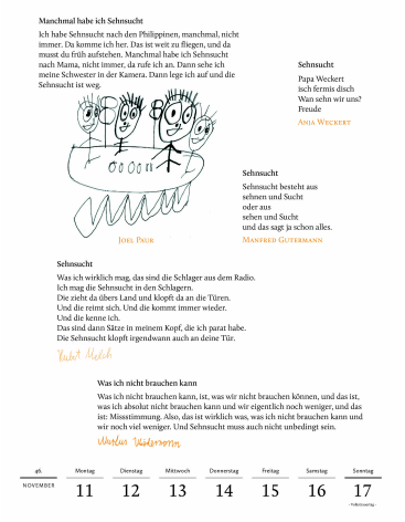 Der grafisch schön gestaltete Kalender hat DinA4 Hochformat und enthält pro Woche ein Blatt mit einem oder mehreren Texten. Zeichnungen und Schriftbilder bereichern den Kalender. Im Anhang finden sich kurze Biografien aller Autor*innen. Ein Exemplar kostet 18 Euro zzgl. Versandkosten. Der Kalender kann bei dem Verein Wortfinder e.V. bestellt werden. Schreiben dafür einfach eine Mail mit der gewünschten Anzahl und Ihrer Liefer-/Rechnungsadresse.