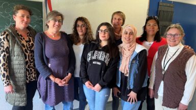 6 von 8 Kursteilnehmer:innen mit der Kursleitung Frau Mathilde Tepper (2te von links) und Frau Nicole Miltschus von der Beratungsstelle Lebenshilfe, (hinten, 3te von rechts)