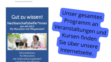 Das Regionalbüro Alter, Pflege und Demenz Münsterland bietet regelmäßig Qualifizierungen für Nachbarschaftshelfer*innen an. Diese finden im Kreis Warendorf, Kreis Soest und in der Stadt Hamm statt. Die Teilnahme ist kostenlos.