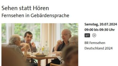 Fernsehen in Gebärdensprache: Am Sa, 20.07.2024 um 9 Uhr wird im Bayerischen Fernsehen ein Beitrag zum Thema „Wie werde ich gut und zufrieden alt?“ gezeigt.