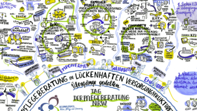Im Anschluss diskutierten die Pflegeberater:innen in sogenannten Dialogräumen miteinander über die Rolle der Pflegeberatung im Kontext von Übergängen im Versorgungssystem. Dabei wurden sowohl Defizite, z.B. die fehlenden Kapazitäten leistungserbringender Dienste als auch Möglichkeiten der Optimierung von Übergängen, z.B. Vernetzung und der regelmäßige Austausch mit Akteuren vor Ort deutlich. Es zeigte sich, dass es in unterschiedlichen Regionen viele ähnliche Erfahrungen sowie einige Ideen gibt, wie man diesem Thema begegnet. Lena Holtschulte griff diese und weitere Erkenntnisse des Tages in einer abschließenden Zusammenfassung und einem Ausblick auf Angebote der Regionalbüros Alter, Pflege und Demenz im Kontext von Vernetzung und Information zum Thema „Übergänge gestalten“ auf.