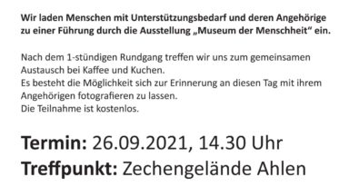 Das Motto des diesjährigen Welt-Alzheimer-Tages (21. September) ist „Genau hinsehen“. Rund um den Welt-Alzheimer-Tag finden in jedem Jahr viele Veranstaltungen und Aktionen zum Thema Demenz statt. Der ehemalige Bürgermeister der Stadt Ahlen, Benedikt Ruhmöller, wird am 26.09. eine Führung durch die Ausstellung „Museum der Menschheit“ anbieten. Nach dem Rundgang geht es zu gemeinsamen Austausch bei Kaffee und Kuchen. Mehr Informationen finden Sie hier in unserem Flyer.